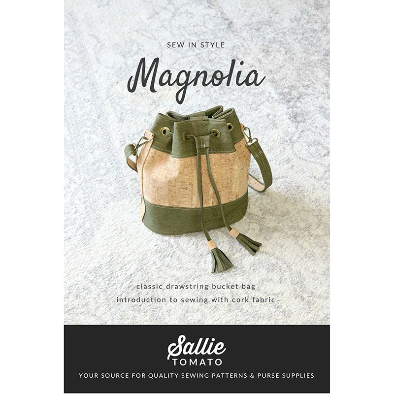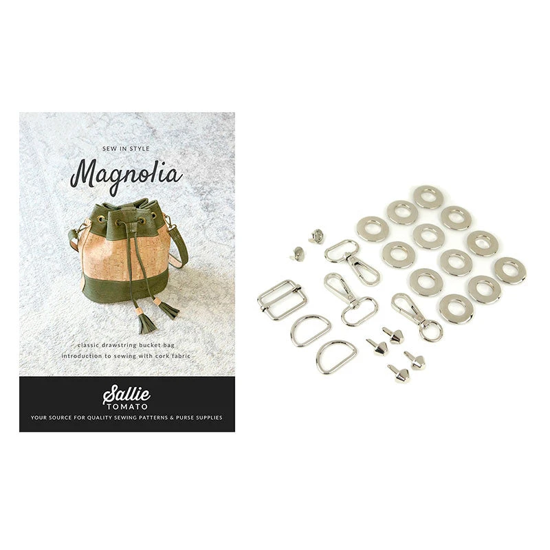 Here’s everything you need to get started making a timeless drawstring bucket bag! This bundle consists of the Magnolia bag pattern and a nickel-finished hardware kit that includes twelve 12mm grommets, two 1″ swivel hooks, two 1″ D-rings, one 1″ slider buckle, four 1/2″ purse feet, one 1/2″ swivel hook, and one magnetic snap. Pair this bundle with your favorite cork fabric and get to sewing!
