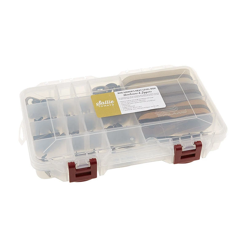 All the hardware you need to make stunning purses and bags in one set! This antique-finished set of hardware and zippers contains all the right tools and pieces for Sallie Tomato purse and bag patterns! Comes with a storage container full of 24 small rivets, 24 medium rivets, 24 large rivets with a rivet toolset (72 total rivets); twelve 1/2″ grommets, 4 handmade labels, 4 tassel caps, 4 zipper/cord ends, four 3/4″ and 4 1″ strap arches (8 total), 1 yard each of beige, gray and natural zippers with 6 total zipper pulls.