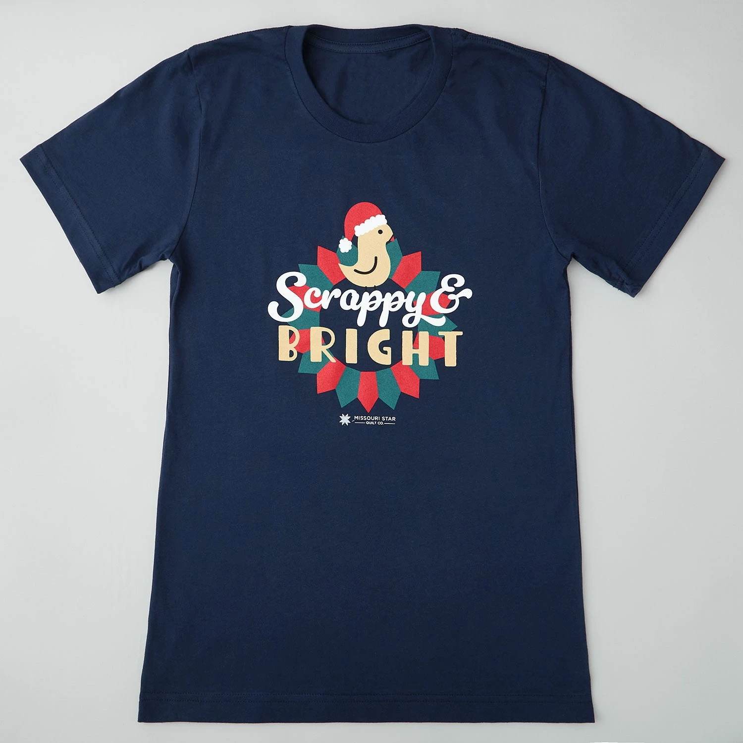 Merry Quackmas! Featuring Missouri Star’s adorable mascot Chuck the Duck in a Santa Hat, the Scrappy & Bright T-shirt will bring you the Christmas spirit all year long. The unisex jersey tee has a crew neck and has the text “Scrappy & Bright” over a red and green Dresden flower on a navy tee. Commemorate Christmas in July by collecting this fun shirt design!
