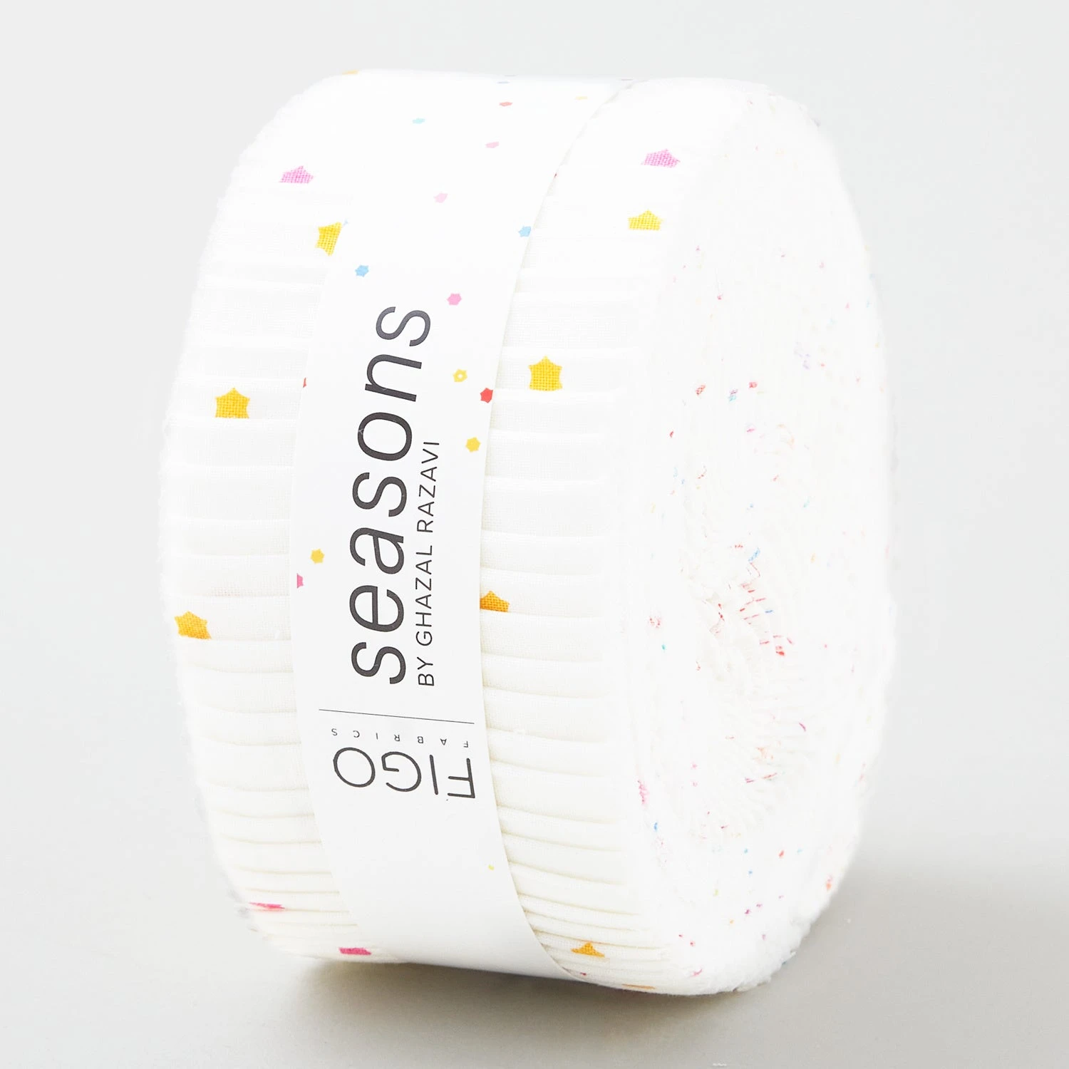 Jelly roll of multicolored star-like flowers tossed on a white background. Seasons change, but the appeal of the Seasons collection from Figo Fabrics will last forever! Designer Ghazal Razavi created fabrics with speckles, dots, abstract flowers, and cascading lines in colors for all seasons. Work one or more of these perennial prints into your next project.