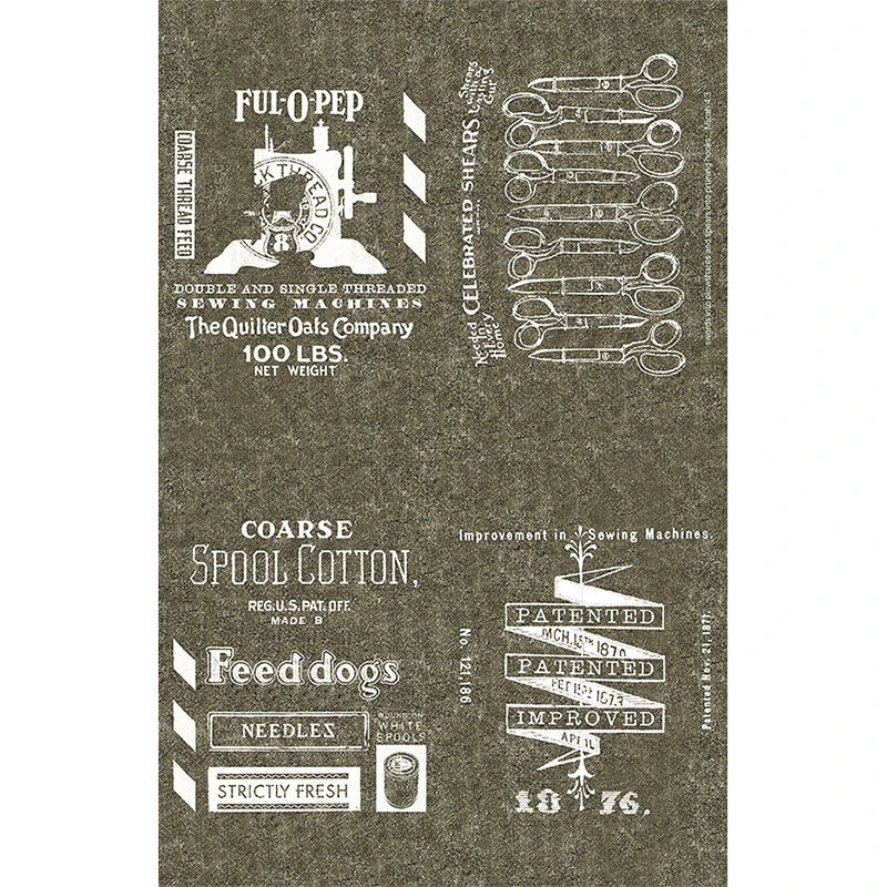 A charcoal gray panel featuring vintage sewing notions and sewing notion advertisements. She Who Sews is inspired by creative and crafty people like you! Designed by J. Wecker Frisch for Riley Blake Designs, She Who Sews features all sorts of fun sewing-themed prints, like sewing machines, spools, pin cushions, sewing scissors, and more.