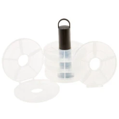 Compact and convenient storage for quilting, sewing and craft supplies. Tower featured a center spindle with handle that holds five removable containers. Each translucent plastic container has a hinged lid with five divided compartments.