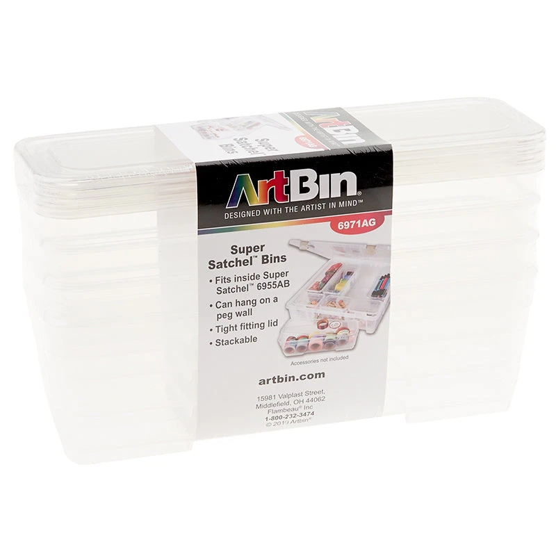 Pack of 4 clear plastic bins for storage and organization. Fits into the Super Satchel brand of products.