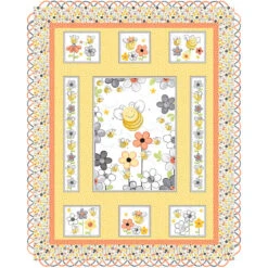 Make a bee-utiful quilt for the littlest one in your brood. This adorable quilt kit features a center panel with smiling honey bees buzzing about surrounded by blooming flowers.