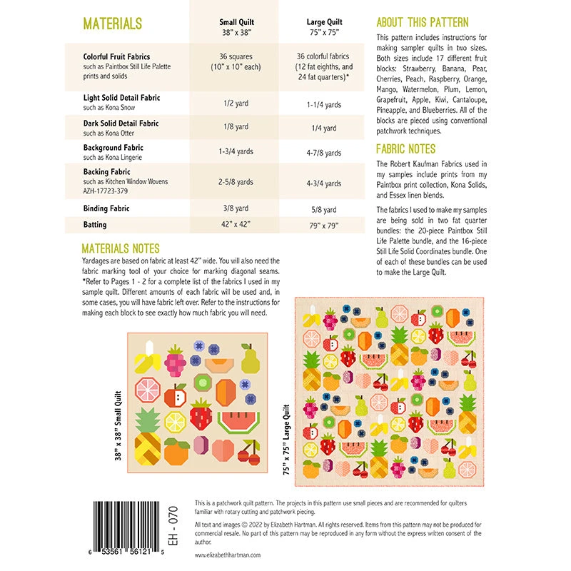 Make a cart full of fruit using conventional patchwork techniques. This pattern includes instructions for two quilt sizes, each featuring 17 different fruit blocks. This project is perfect for the intermediate quilters.