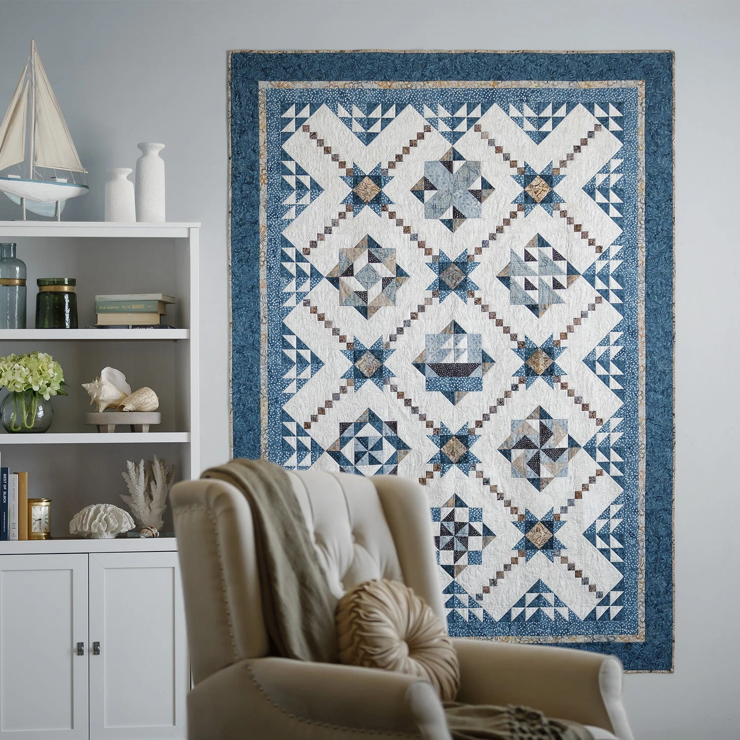 Don’t let the name of this gorgeous Block of the Month fool you because it’s smooth sailing ahead for you! The Tonga Lakeside Rough Waters BOM is a great quilt for showing off your piecing skills, and the soothing “lakeside” colors make it the perfect quilt to display anywhere in your home.