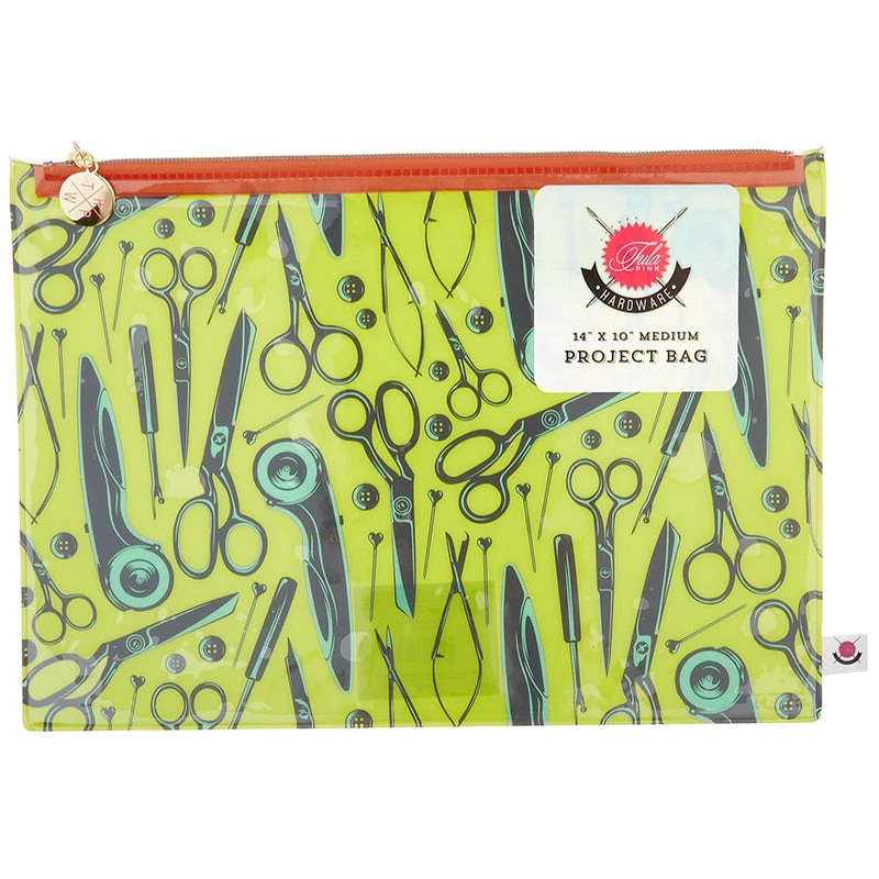 Handy vinyl zippered bag for notions featuring designs from Tula Pink’s Handmade collection on the front and clear on the back for a quick glance of the bag contents.