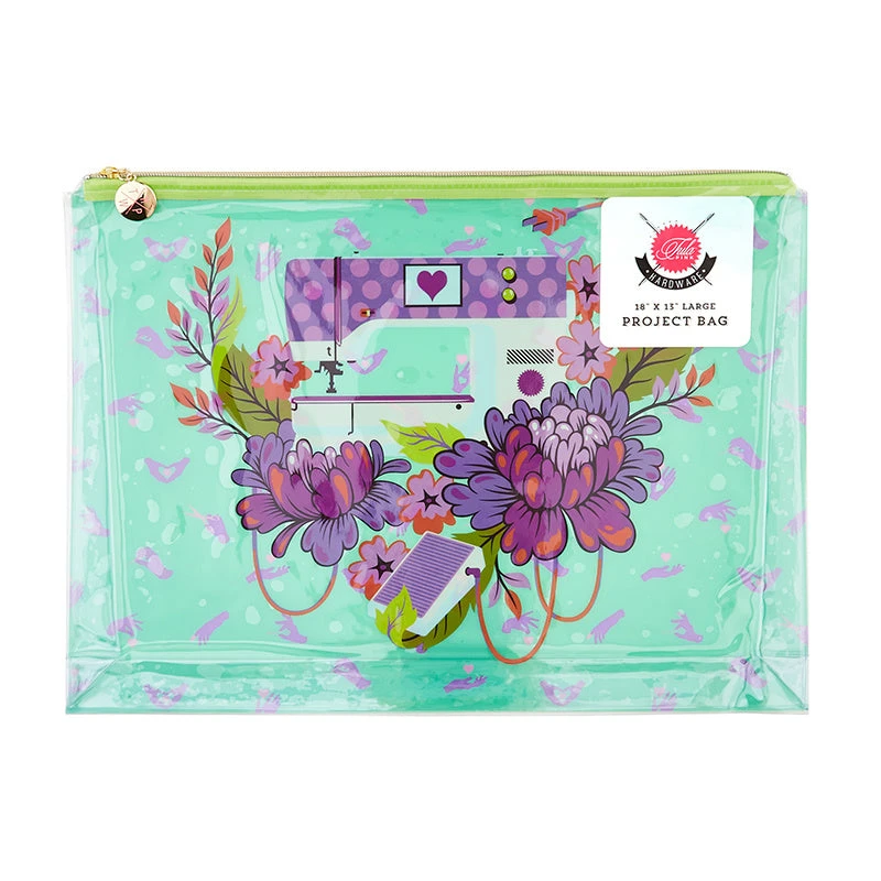 Handy vinyl zippered bag for notions featuring designs from Tula Pink’s Handmade collection on the front and clear on the back for a quick glance of the bag contents.