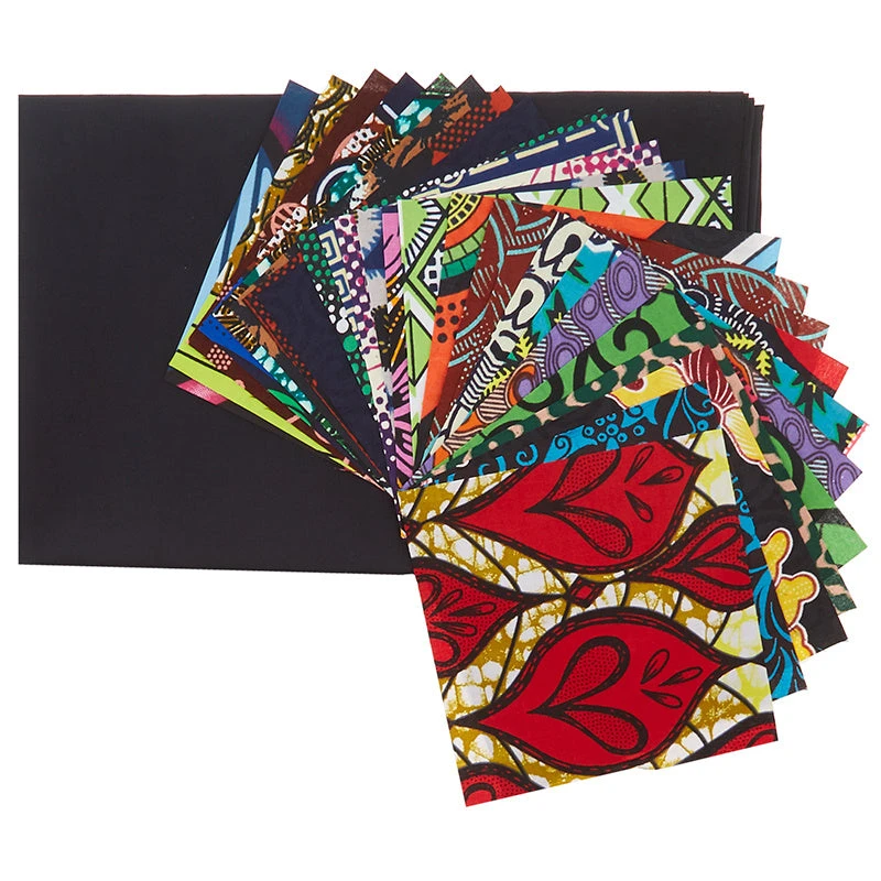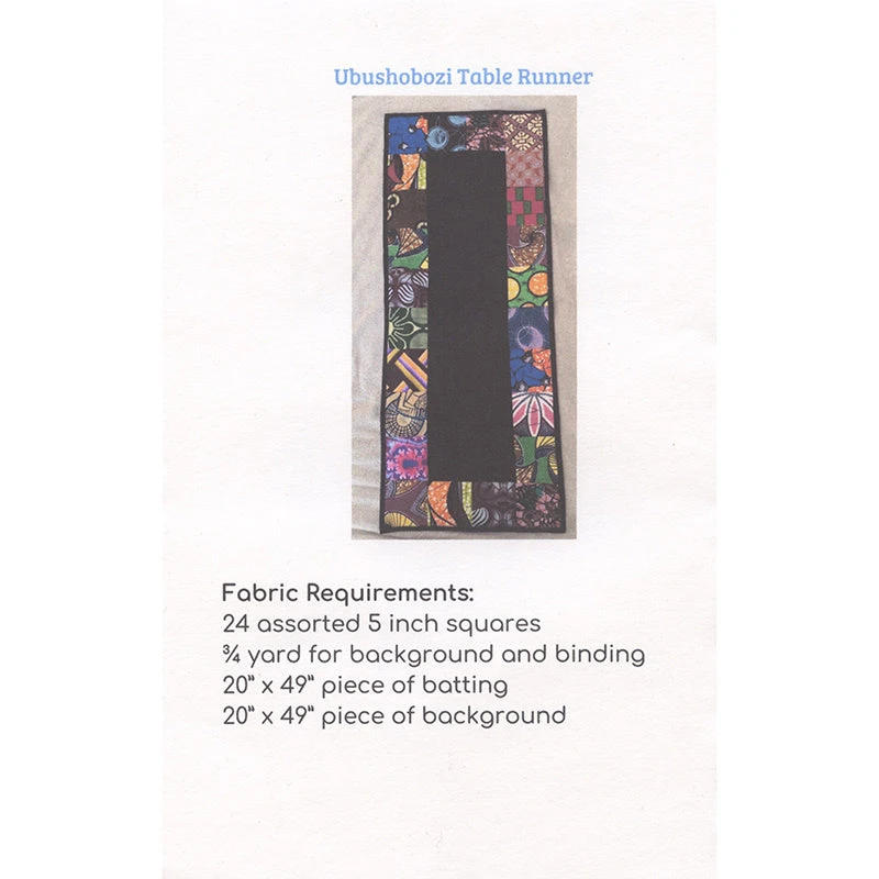This pieced table runner kit contains a pattern and Authentic African Prints for the top and binding, including precut 5″ squares, by the Ubushobozi Women’s Collective. The wax prints are a form of non-verbal communication among African women. Each print has meaning and they are used in many of their cultural celebrations and have become collectible.