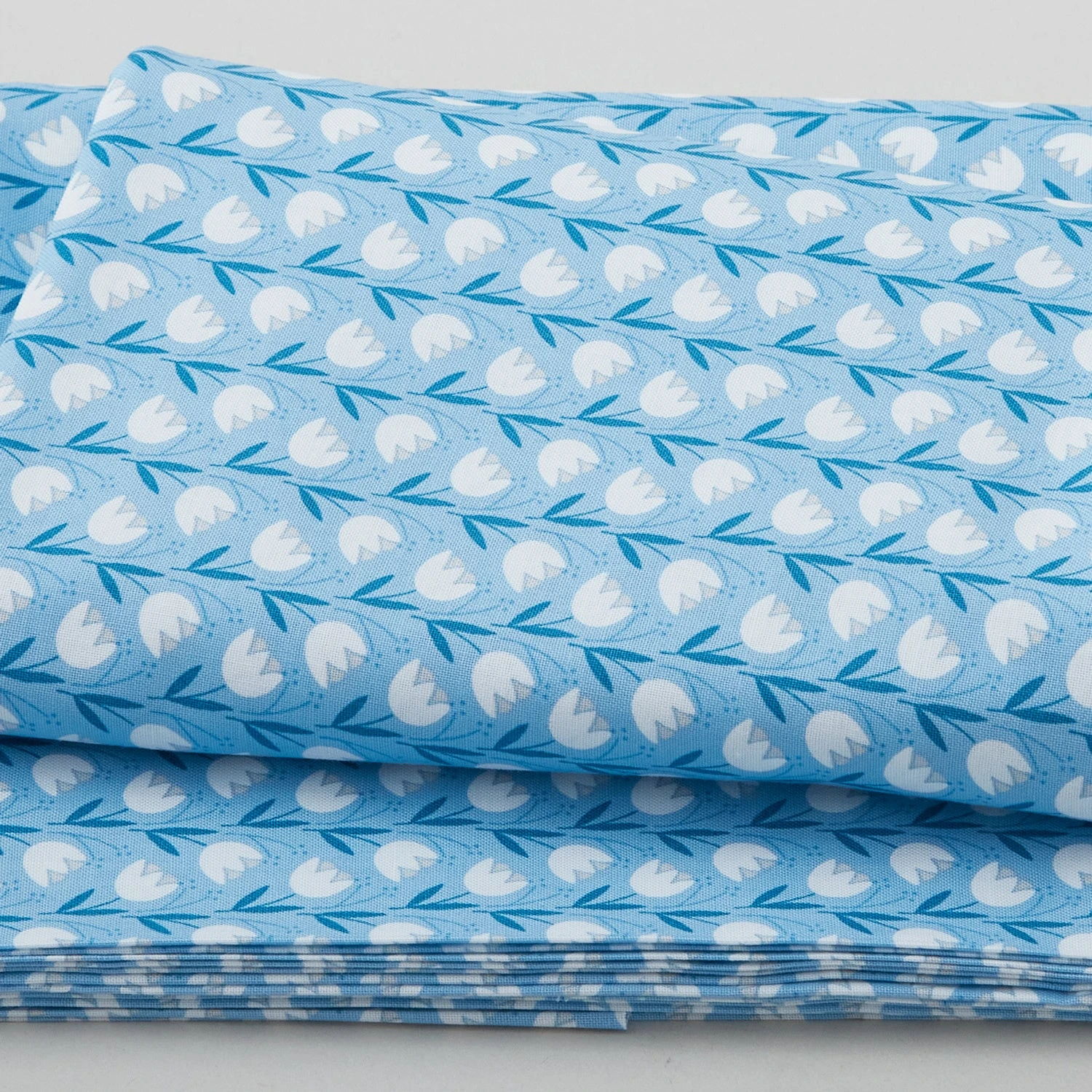 A 3-yard cut of white and gray tulips on a blue background. Pretty flowers and trees fill Windsong Meadows from Wilmington Prints. The blue, teal and gray prints come together to create a beautiful, cool color palette.