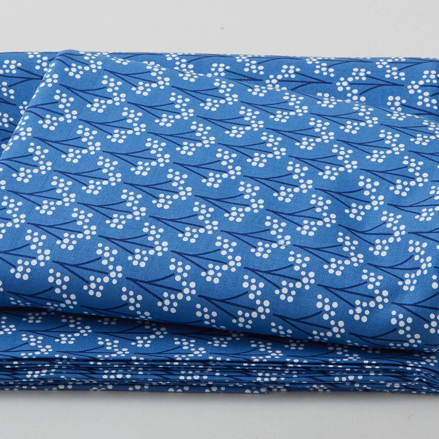 A 3-yard cut of blue trees with white dotted leaves on a blue background. Pretty flowers and trees fill Windsong Meadows from Wilmington Prints. The blue, teal and gray prints come together to create a beautiful, cool color palette.